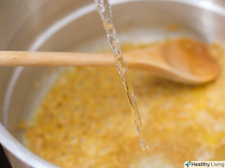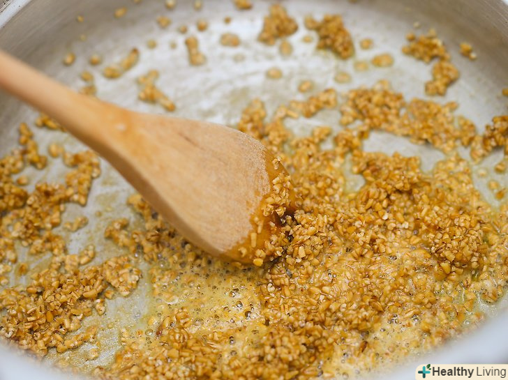 Додайте необроблений овес в каструлю.перемішайте його з маслом дерев'яною ложкою. Смажте овес, помішуючи іноді, протягом приблизно трьох хвилин, або до коричневого кольору.[2]