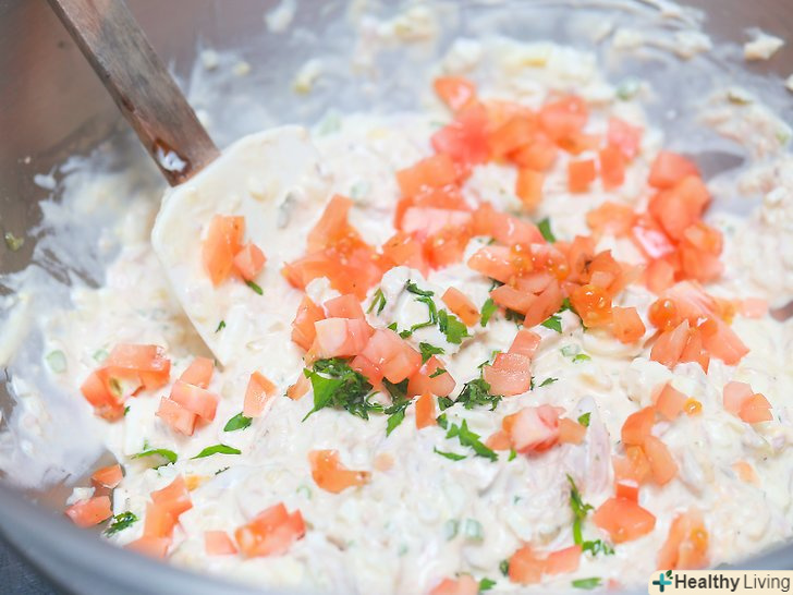 Перемішайте всі інгредієнти.у мисці середнього розміру змішайте разом тунець, сік лимона, помідори, селера, зелену цибулю і сметану.- Перемішайте.
