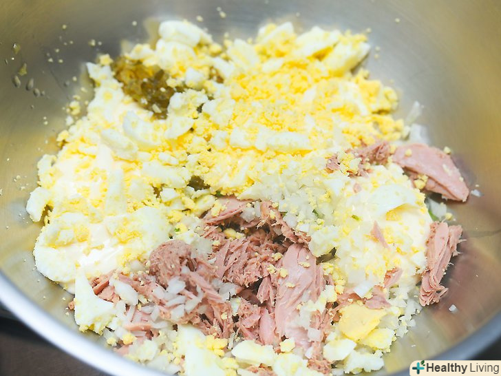 Перемішайте всі інгредієнти.у мисці середнього розміру змішайте разом тунець, яйця, селера і майонез.- Перемішайте.