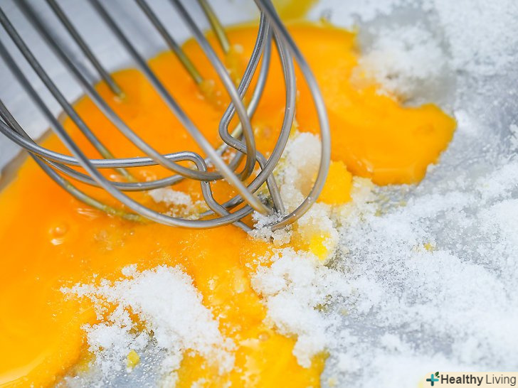 Збийте яєчні жовтки з цукром.покладіть жовтки і 6 столових ложок цукру в металеву миску середнього розміру. Збийте їх енергійно віночком, поки суміш не стане блідо-жовтої і повітряної. Ви можете використовувати електричний міксер замість віночка.
