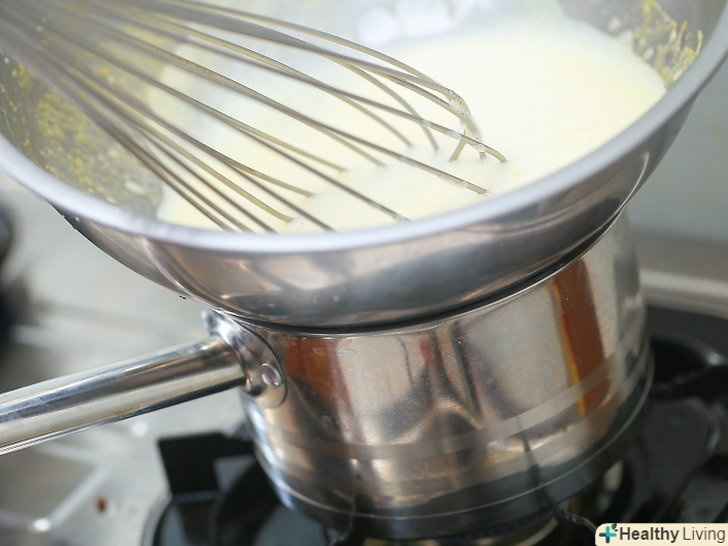 Вилийте соус у водяну баню.переконайтеся, що вода в нижній частині пароварки кипить, і налийте яйце, цукор і молоко у верхню частину водяної бані (або миску, якщо ви зробили власну пароварку).