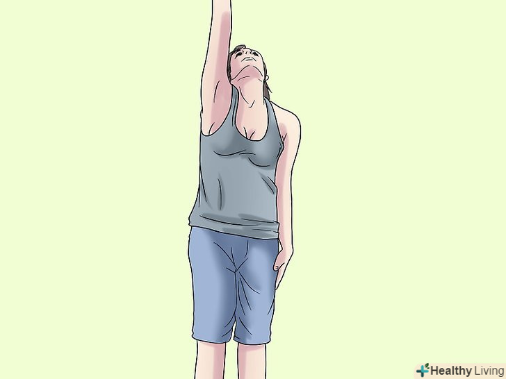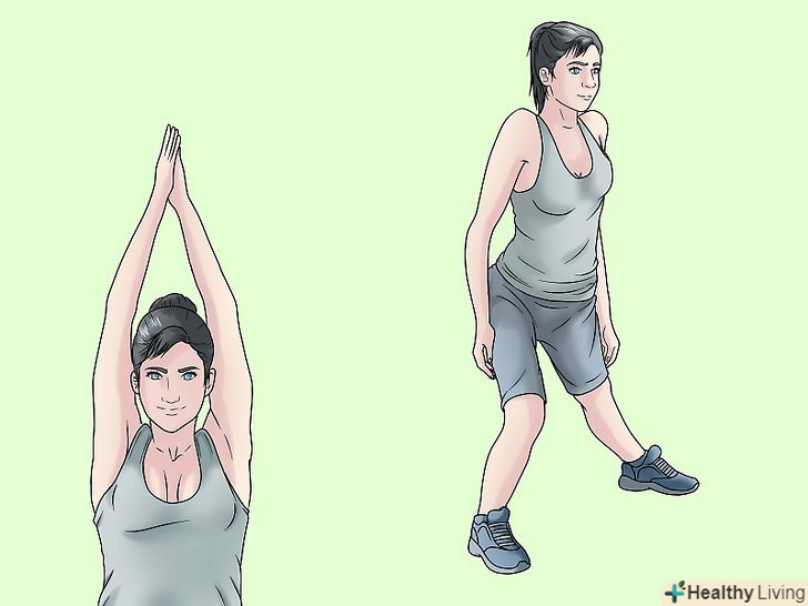 Відразу після ' вниз, ха!підніміть руки і зробіть бавовна над головою. Повільно опустіть руки і стопою ковзніть в сторону. Смикніть плечима, поверніть голову в ту ж сторону, а потім повторіть рух в іншу сторону.