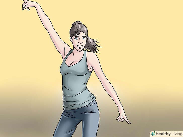 Стрибайте! Потім нагніться і торкніться шкарпеток двічі. Візьміть кльовий вид на чотири такту, потім поверніться і знову зробіть кльовий вид на чотири такту, знову поверніться, закиньте руку над головою і поверніться в позу "невидима гітара". Покрутіть ногою на один такт, потім підніміть руку і опустіть, але на цей раз опускайте за п'ять тактів. Схопитеся за повітря з одного боку, потім чотири рази штовхніть його з іншого боку.