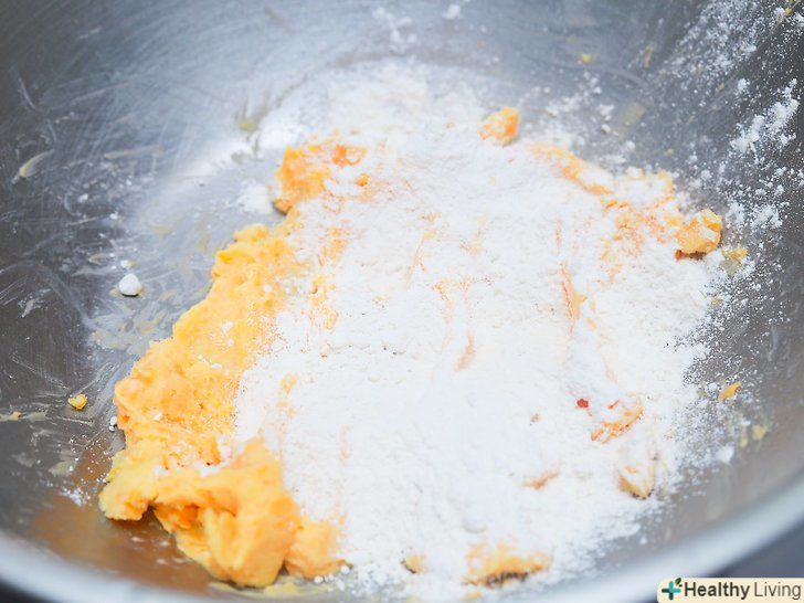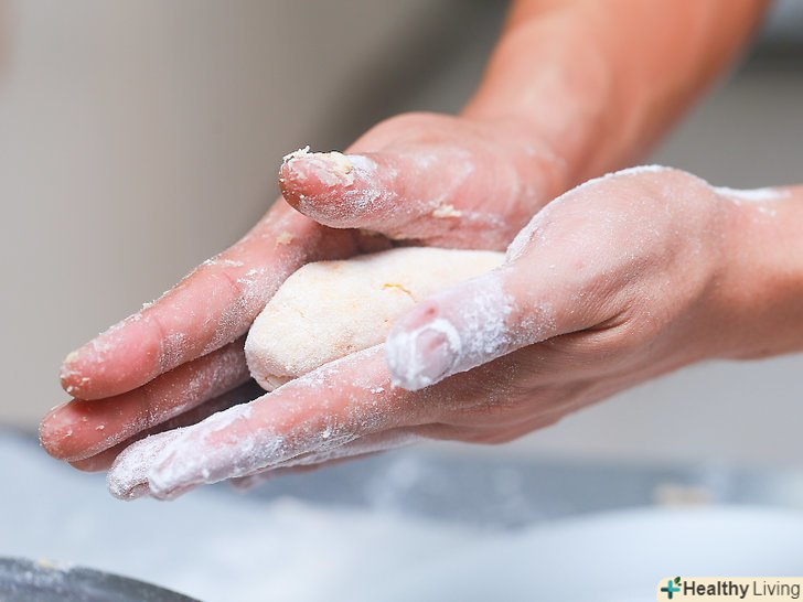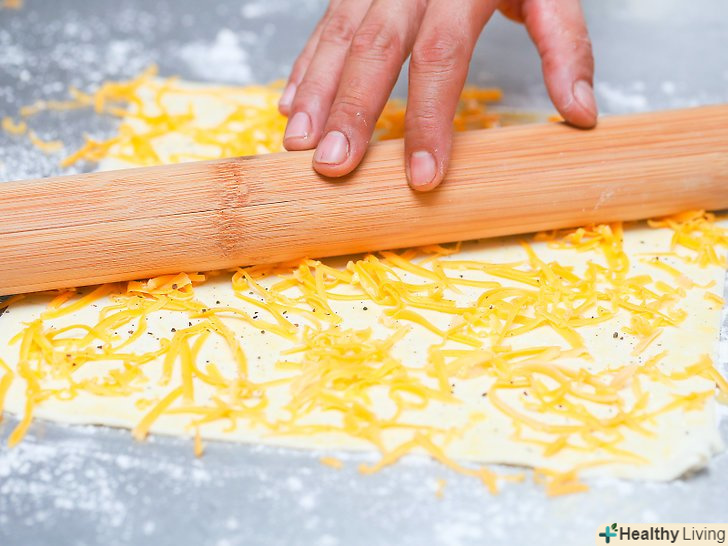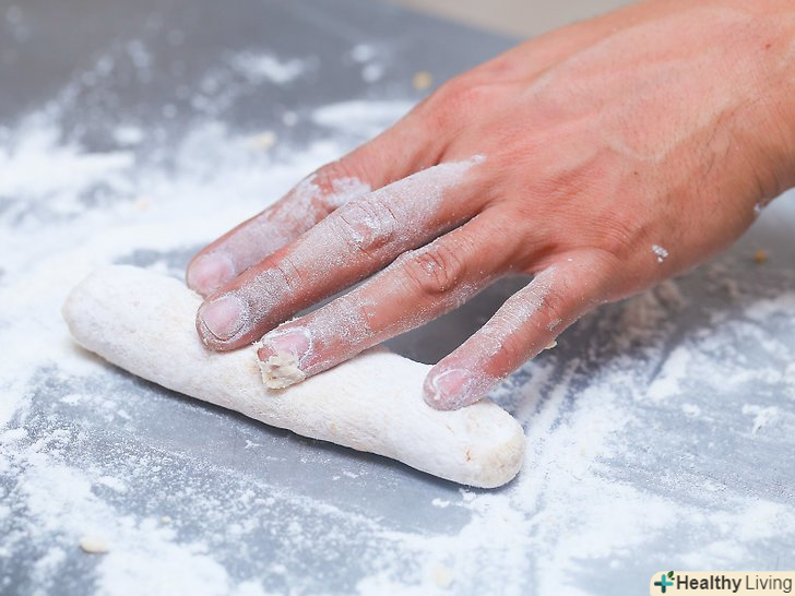 Зробіть тісто.просійте 3 склянки борошна з сіллю, чорним перцем, кайенским перцем і часниковим порошком. Додавайте в сирну масу просіяне борошно по одній столовій ложці. Продовжуйте місити масу в міру додавання борошна. Всипте стільки борошна, щоб тісто стало трохи жорстким, але все ще податливим.- Вам не обов'язково використовувати всю муку. Якщо суміш тісто стане досить пружним у міру вимішування, не потрібно додавати в нього все борошно, що залишилося.