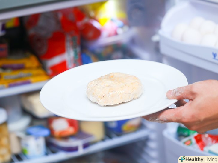 Замісіть тісто.у великій мисці змішайте мигдальне і кокосове борошно, крохмаль з аррорута, ксантанову камедь, порошок часнику і сіль. Поступово додайте вершкове масло. Змішуйте до тих пір, поки суміш не буде виглядати як крихти. Вливайте воду по 1 столовій ложці, поки суміш не утворює тісто. Скачайте тісто в плоский диск і накрийте поліетиленовою плівкою. Поставте в холодильник на 30 хвилин.[6]- Якщо у вас є кухонний комбайн, можете приготувати тісто в ньому. Сухі інгредієнти збивайте в першу чергу. Додайте вершкове масло перетріть все в комбайні до крихт. Потім додайте воду згідно з рецептом.