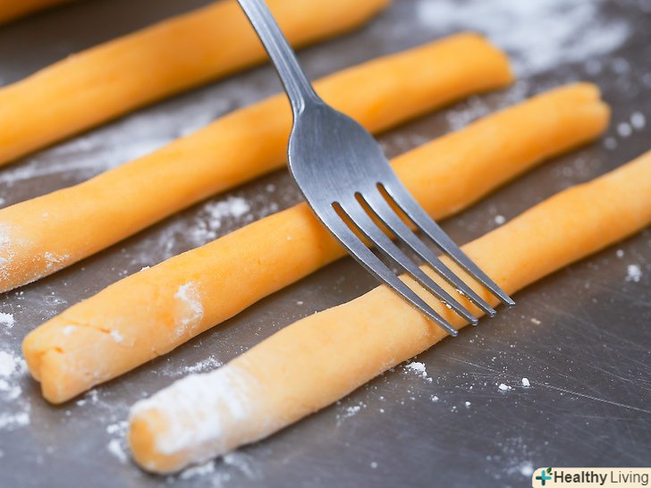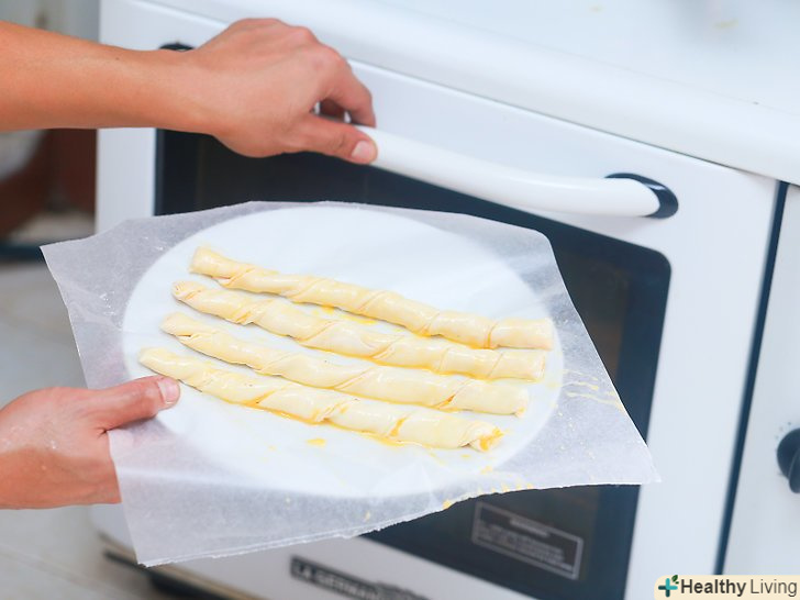 Зробіть соломку з тіста.Розкачуйте тісто до тих пір, поки воно не стане близько 6 мм завтовшки. Розріжте його на смужки по 15 см в довжину і 1,2 см в ширину.- Можливо доведеться посипати робочу поверхню борошном, щоб до неї не прилипало тісто.
