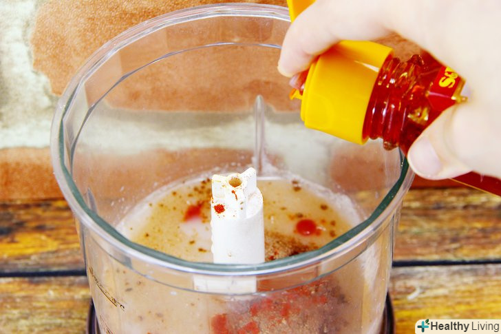 Додайте приправи.додатково помістіть в блендер цукор, гірчичний порошок, цибульний порошок, сіль, паприку і гострий соус і продовжуйте збивати вміст на високій швидкості ще 30 секунд або близько того.- Переконайтеся в тому, що використовуваний вами гострий соус підходить веганам. При бажанні можна відмовитися від соусу і використовувати 3 невеликих дрібно нарізаних стручка перцю чилі.