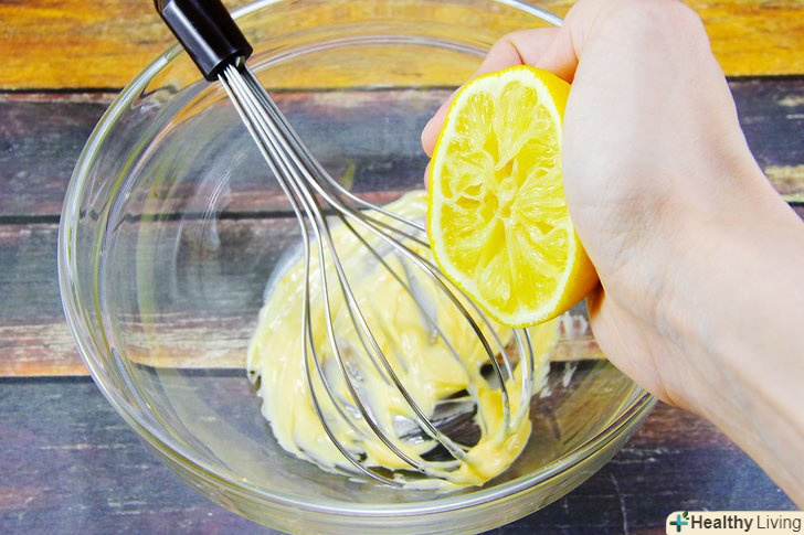При бажанні додайте лимонний сік.влийте до складу лимонний сік і знову ретельно попрацюйте віночком для змішування інгредієнтів.- Використовувати лимонний сік не обов'язково, але якщо майонез здасться вам на смак занадто гострим, то додавання лимонного соку дозволить частково погасити цю гостроту.