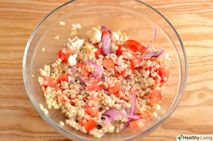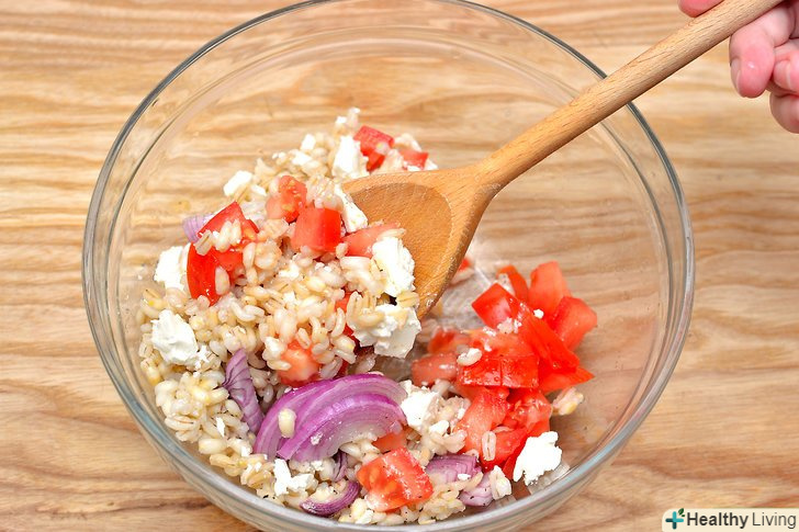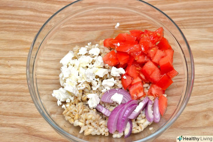 Викладіть приготований ячмінь в миску.додайте помідорів, цибулі та сиру фета.