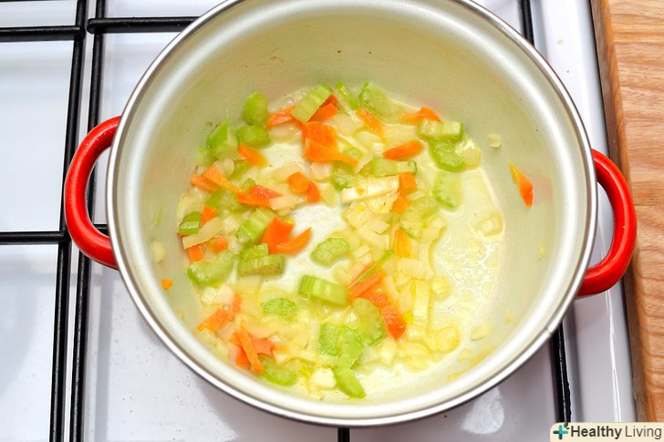 Додайте цибулі, моркви і селери.готуйте, помішуючи час від часу, поки цибуля не стане прозорим. Це повинно зайняти близько п'яти хвилин.