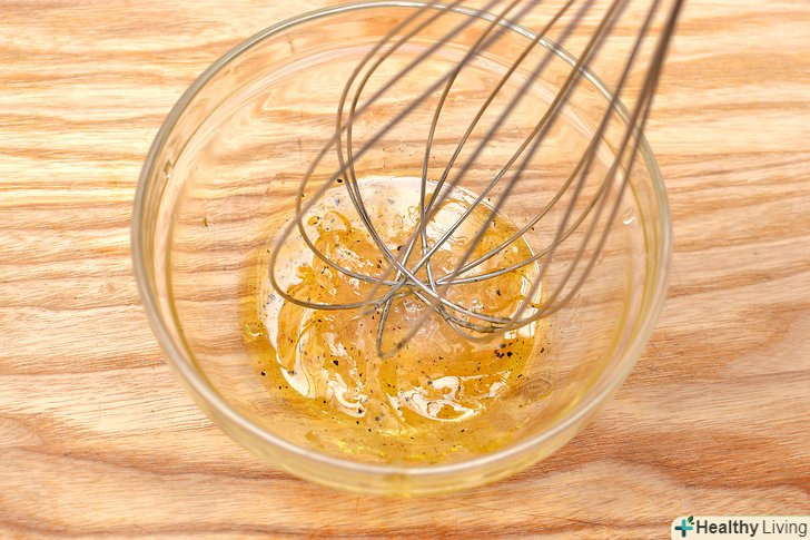 В іншій мисці змішайте оцет з червоного вина, оливкова олія, щіпку солі і перцю.Візьміть віник і перемішайте інгредієнти протягом хвилини.