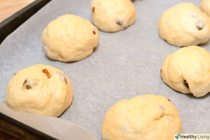 Використовуючи ніж, поріжте тісто на дванадцять однакових шматочків.скачайте кожен шматочок в кулю і помістіть їх на деко для запікання. Вам слід поставити булочки в тепле місце, щоб вони трохи збільшилися в розмірі. Накрийте їх чистим кухонним рушником (ви можете використовувати той же самий рушник, просто перевернувши його чистою стороною) і залиште їх на півгодини.