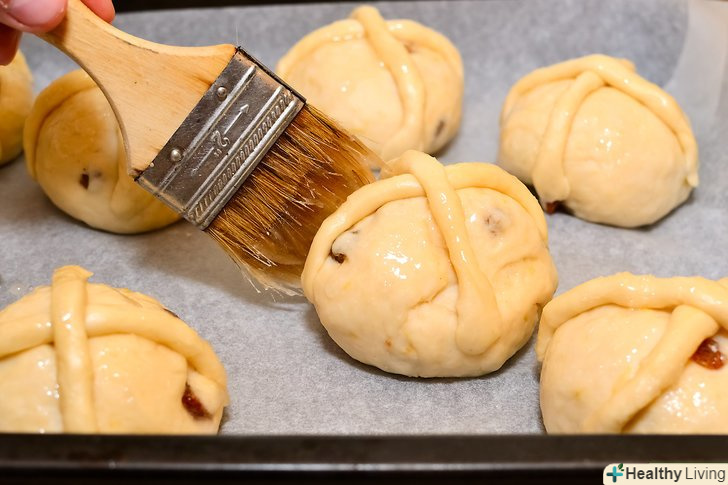 Приготуйте булочки для запікання.після того, як вони збільшилися в розмірі, приберіть кухонний рушник і покрийте глазур'ю кожну булочку, за допомогою кулінарної кисті. Покладіть на кожну булочку, зроблені раніше ковбаски з тіста, щоб вони утворювали хрест. Використовуйте глазур, щоб закріпити хрест і покрити його.