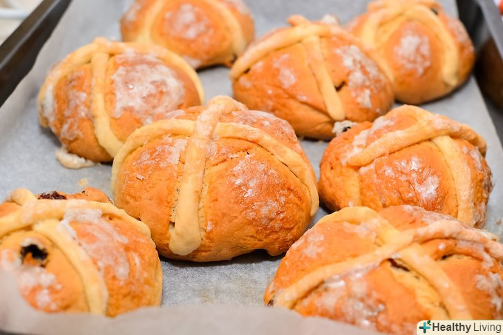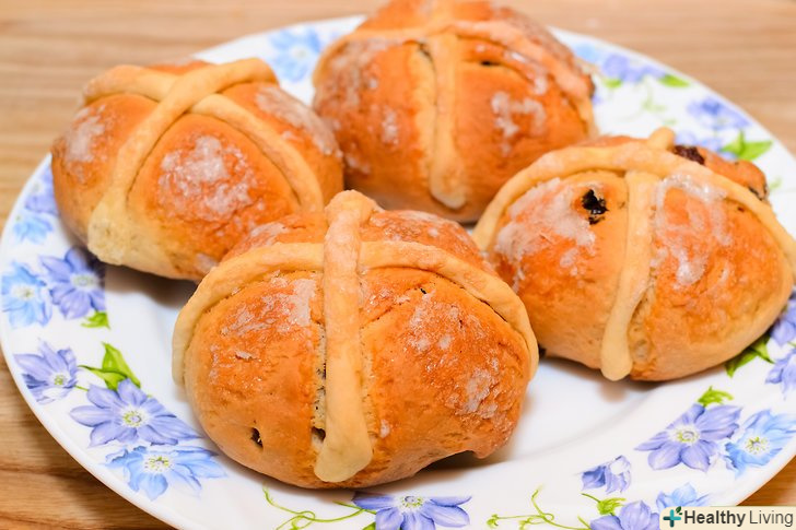 Помістіть булочки в духовку.випікайте протягом двадцяти хвилин, або поки не побачите, що булочки стали золотисто-коричневого кольору. Слідкуйте, щоб хрестики не надто запеклися і не почорніли.