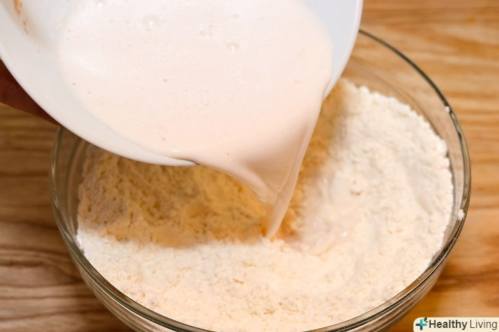 Просійте борошно у велику миску.Зробіть в центрі борошна поглиблення і додайте дріжджову суміш.