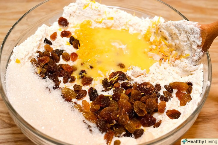 Додайте спеції, цукор, смородину, суміш цедри, включаючи лимонну і розтоплений маргарин в миску.гарненько заважайте, поки інгредієнти не розташуються рівномірно.