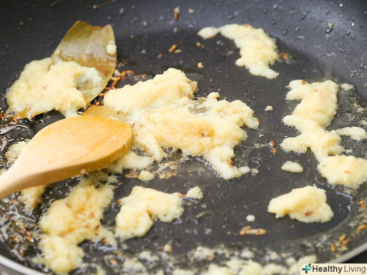 Додайте овочеву пасту з комбайна або блендера.готуйте інгредієнти, періодично помішуючи їх дерев'яною ложкою протягом 10-15 хвилин або поки вони не стануть золотисто-коричневого кольору.