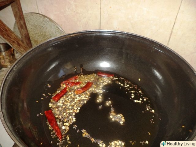 Додайте червоний перець чилі, насіння кмину, насіння гірчиці та білої сочевиці. Обсмажуйте протягом декількох хвилин.