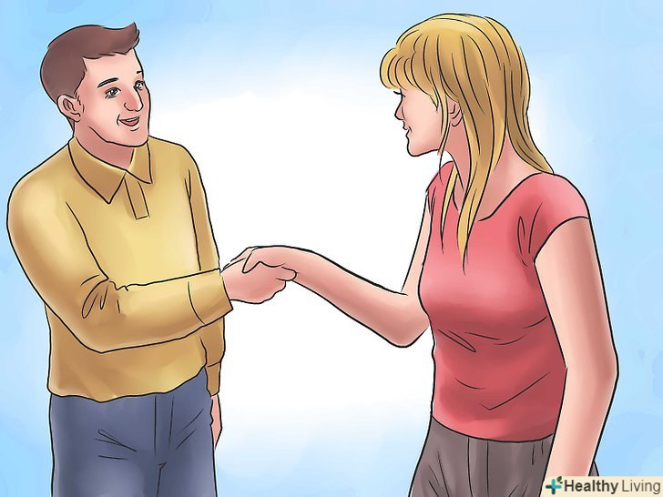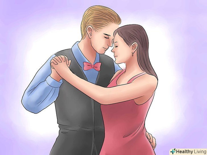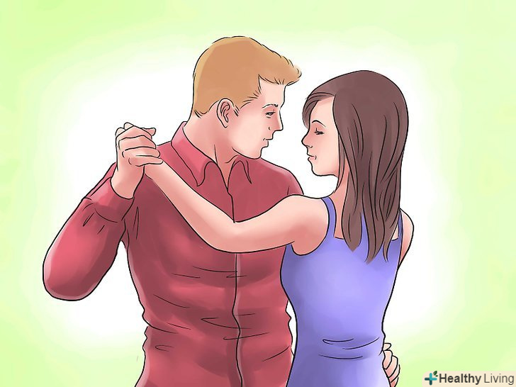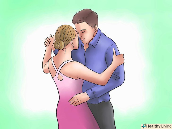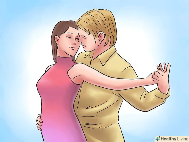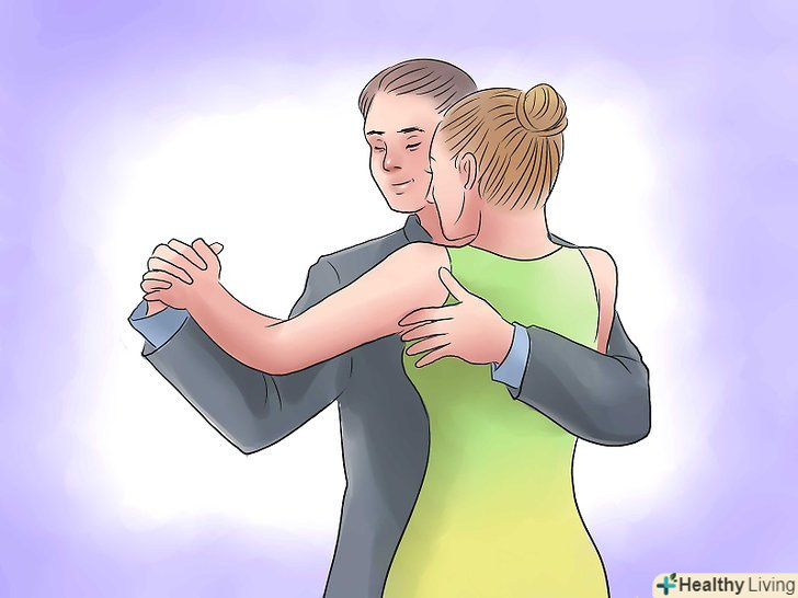 Почніть з обіймів.у танго обійми-це numero uno. Так, обійнятися просто, але обійми повинні бути одночасно чуттєвими, легкими і міцними. Простіше кажучи, обидва партнери повинні бути дзеркальним відображенням один одного.- Партнер піднімає ліву руку і охоплює правою рукою партнерку, поклавши руку їй на спину злігу нижче її лопаток. Партнерка кладе праву руку на ліву руку партнера, а лівою рукою охоплює його, поклавши її теж на середину його спини.