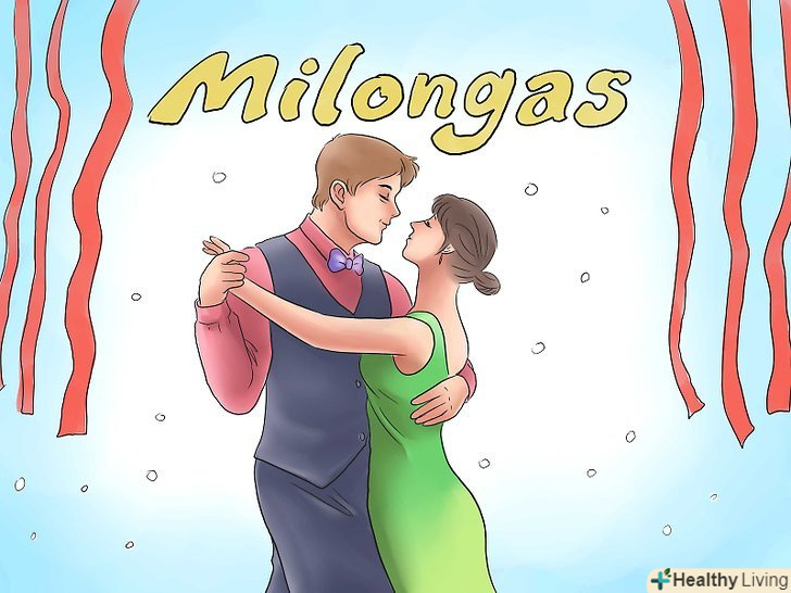 Ходіть на вечори мілонги і танго і показуйте себе.якщо ви йдете один, то знайдіть собі партнера за допомогою cabeceo (Ісп. «кивок» — сигнал запрошення або згоди на танець). Не потрібно питати, домовтеся поглядом. Зустрілися поглядом-посміхніться або кивніть. Якщо людина не відповідає вам, шукайте іншого. Такий спосіб не так нав'язливий і не тисне на людину.- Один танцювальний сет, або tanda, включає в себе 4 танцю. Тому якщо ви не впевнені, що хочете танцювати з цією людиною всі 4 танцю, то запросіть його під час 2-го або 3-го сету.