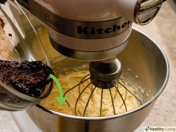 Зменшіть швидкість і додайте шоколад.якщо на міксері була виставлена висока швидкість, на даному етапі слід знизити її. Після цього додайте шоколад і перемішайте ще трохи. Можливо, вам знадобиться лопатка, щоб дістати з миски весь шоколад.
