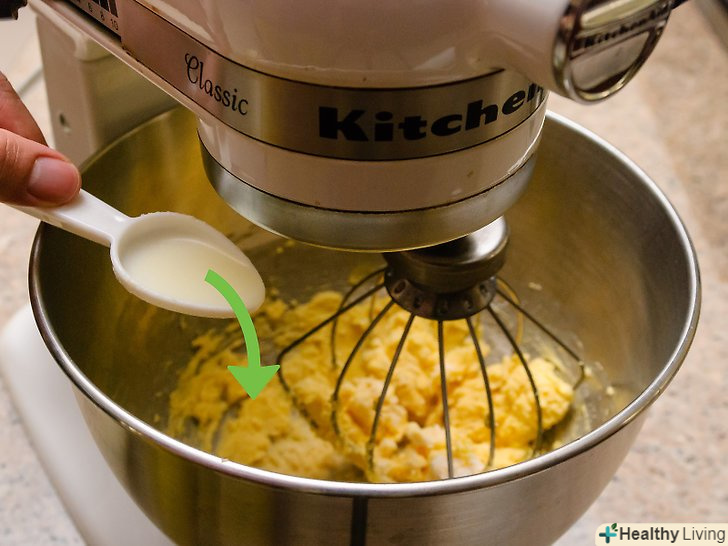 Додайте інші інгредієнти і продовжуйте перемішувати на малій швидкості.щоб глазур вийшла густішою і її було зручно наносити за допомогою кондитерської насадки, додайте лише одну чайну ложку (5 мілілітрів) молока або вершків. Якщо ви віддаєте перевагу більш рідку і розтікається глазур, можна додати 2 столові ложки (30 мілілітрів) молока або вершків. Якщо ж ви не впевнені, скільки молока або вершків слід використовувати, додайте спочатку 1/2 чайної ложки (2,5 мілілітра) і подивіться, що вийде. Замість ванільного екстракту можна додати 1 чайну ложку (5 мілілітрів) іншої ароматичної речовини, якщо ви віддаєте перевагу іншому аромату. Можливі варіанти ви знайдете тут. Щоб вершково-Масляна глазур вийшла менш жирною, використовуйте замість збитих вершків молоко.- Якщо ви хочете, щоб глазур вийшла менш солодкою, додайте дрібку солі.