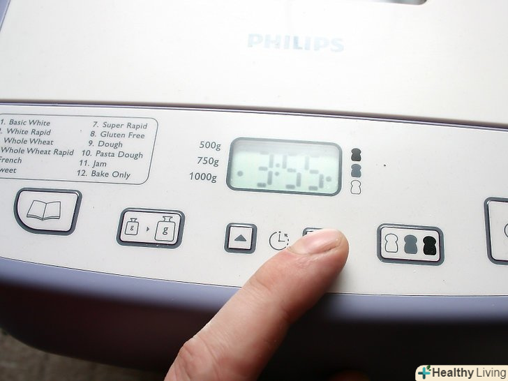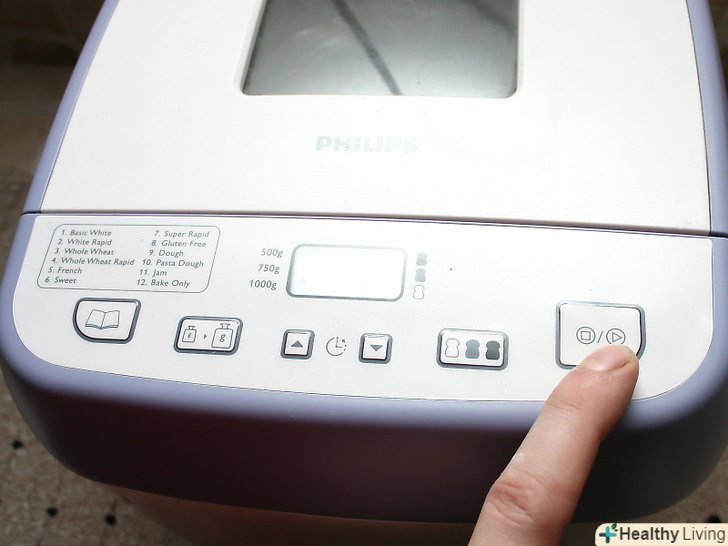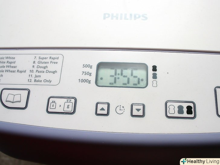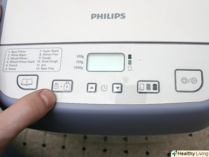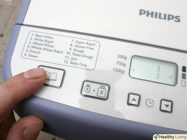 Вивчіть Налаштування хлібопічки.уважно подивіться на кнопки і дисплей на контрольній панелі. Ймовірно. Ви побачите кнопки вибір, Старт/Стоп, колір скоринки, Таймер і кнопки зі стрілочками. Вимкніть хлібопічку від мережі. Включать. Тепер хлібопічка буде в основному режимі.- Поруч з кнопкою вибору будуть ще кнопки, наприклад, основний, пшеничний, житній, цільнозерновий, французький, Без глютену, здоба, швидкий, тісто. Щоб виставити певний режим, натискайте кнопку Вибір до тих пір, поки бажаний режим не висвітиться. Зазвичай основний або пшеничний йде під номером 1, цільнозерновий під номером 2, французький під номером 3 і так далі. Кожен режим вимагає різну кількість часу на вимішування і випічку.