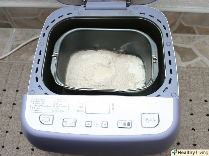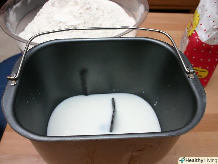 Додавайте інгредієнти в правильному порядку.для більшості хлібопічок спочатку необхідно насипати в відерце хлібопічки швидкодіючі дріжджі, потім борошно, а потім інші інгредієнти. Важливо, щоб дріжджі не контактували з рідиною, особливо при відстроченої випічці на таймері. Меншість хлібопічок припускають інший порядок закладки інгредієнтів-почитайте інформацію на кулінарних форумах, де власники таких же хлібопічці порадять вам правильний варіант. Головне, не допускайте взаємодії рідини і дріжджів при відстроченої випічці на таймері, щоб дріжджі не почали діяти завчасно. Ось приклад закладки інгредієнтів для деяких хлібопічок:- Покладіть рідкі інгредієнти.