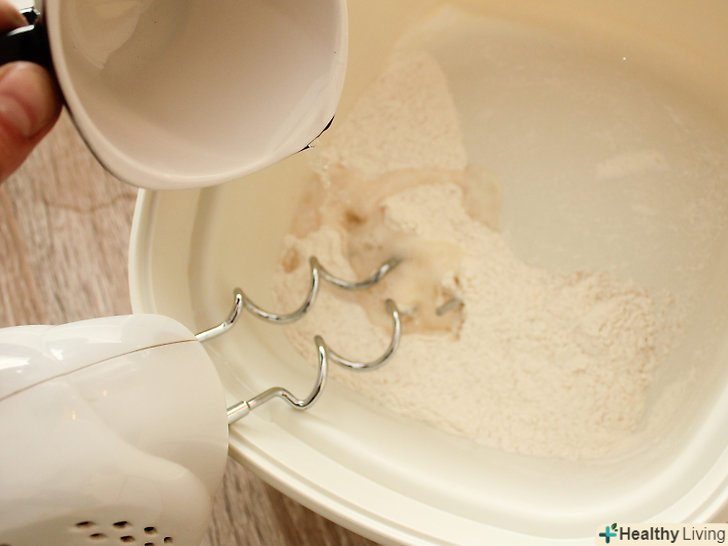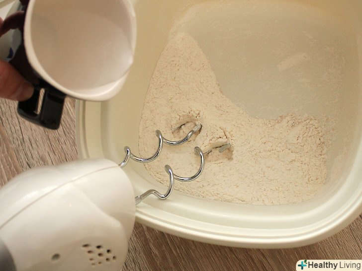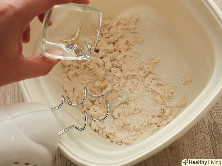 Повільно влийте воду і змішуйте міксером на низькій швидкості до тих пір, поки тісто не прийме форму кульки.