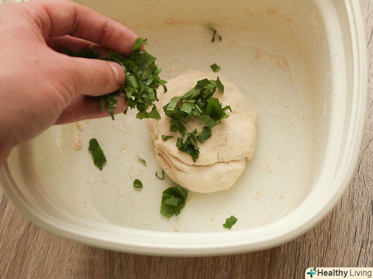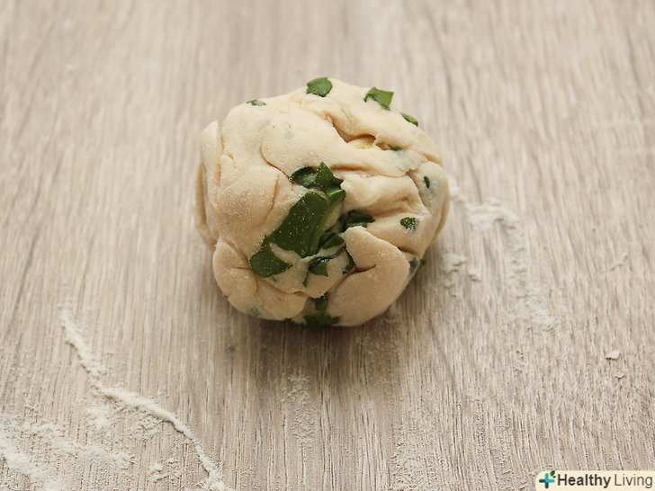 Додайте зелень і замішуйте тісто на злегка посипаній борошном поверхні протягом приблизно 5 хвилин, або до тих пір, поки воно не стане гладким і еластичним.