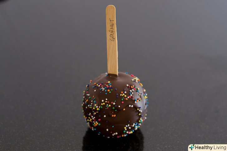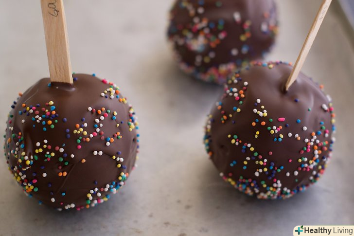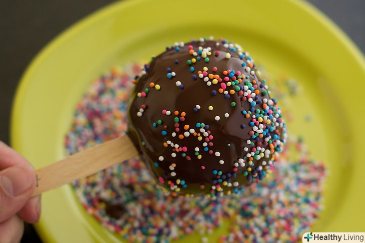 Обваляйте яблука в посипанні.можете використовувати руки для того, щоб рівномірно покрити яблука. Якщо посипання падає під вагою, підправте руками з усіх боків.- Якщо ви використовуєте поливання, то помістіть яблука на вощений папір, паличкою вгору. Потім просто візьміть ложку з поливанням і, тримаючи її на відстані приблизно 15 см над яблуком, створюючи лінії різної товщини на яблуці.