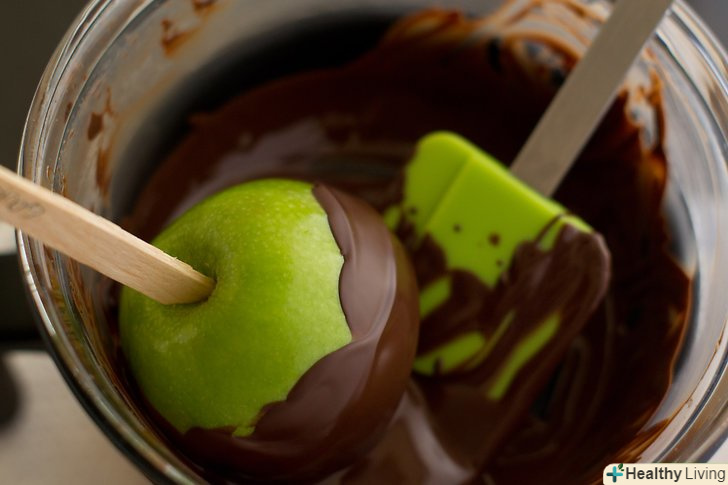 Занурюйте кожне яблуко в шоколад.підніміть його і дайте зайвому шоколаду стекти назад в миску. Покрутіть, повертаючи паличку, дозволяючи всім частинам яблука покритися красивим рівномірним покриттям.- Якщо частини навколо палички трохи складніше дістати, візьміть ложку і підмажте все важкодоступні місця. Шар шоколаду повинен бути рівномірним з усіх боків.
