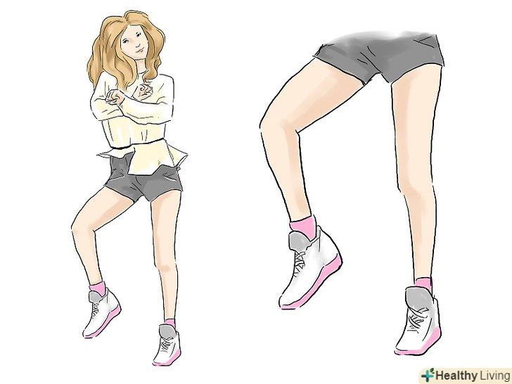 Вивчіть кроки. Почніть правою ногою. Підніміть її невисоко прямо над підлогою і поверніть її на місці, завершивши рух невеликим підскоком з просуванням назад.- Щоб виконати підскік, опустіть ногу на підлогу, і дайте їй трохи відскочити, але в цей час відведіть її на кілька сантиметрів назад, замість того щоб дати їй знову відскочити наверх. Щоб утримати рівновагу вам доведеться трохи підстрибувати, що теж є частиною танцю.