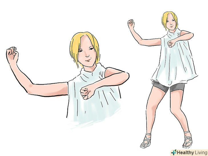 Навчіться робити "ласо".почніть рух піднявши ліву руку вгору, так щоб зовнішня сторона вашого зап'ястя була поруч з підборіддям, ваш лівий лікоть спрямований прямо наліво, і ваше передпліччя паралельно підлозі.- Підніміть праву руку, так щоб ваша верхня рука була на рівні плеча, а ваш правий лікоть спрямований по діагоналі направо.
