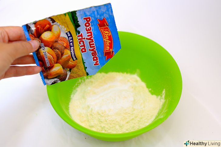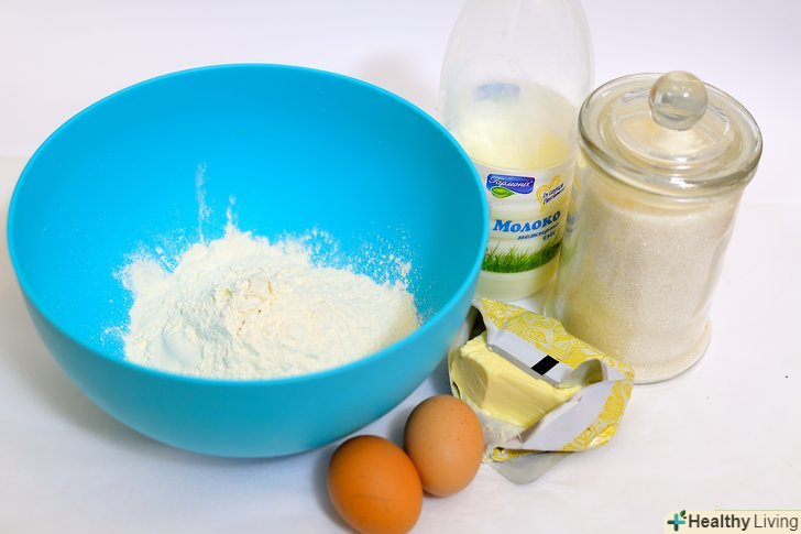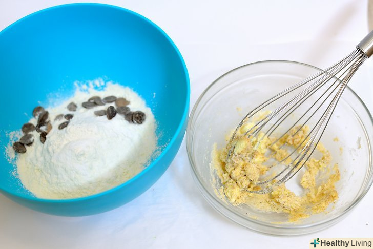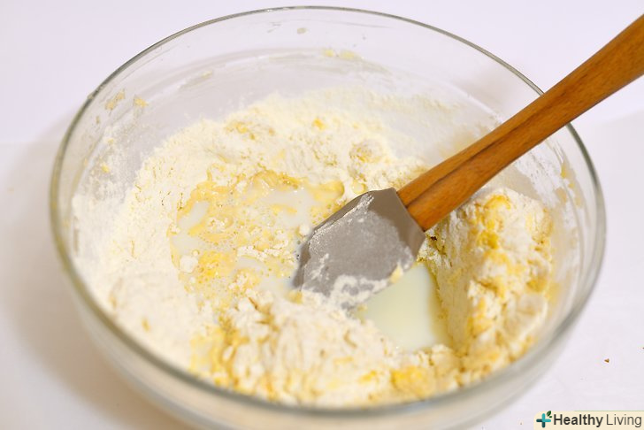 Приготуйте борошняну суміш.візьміть невелику миску і змішайте в ній борошно, пекарський порошок, харчову соду і сіль. Коли вийде однорідна маса, додайте невелику її кількість в масляну суміш. Продовжуйте поступово додавати борошняну суміш і молоко в масло, поки не змішаєте їх повністю.[29]- Перемішуйте спочатку повільно і лише потім збільшуйте швидкість.