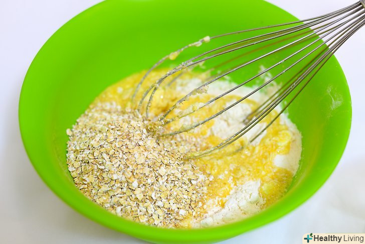 Додайте сухі інгредієнти.після того, як ви як слід зіб'єте масло, додайте в нього борошняну суміш і перемішайте до утворення однорідної маси. Потім поступово додайте вівсяні пластівці і знову як слід перемішайте інгредієнти. Це повинно зайняти близько двох хвилин.[23]- Можна також перемішати отриману суміш дерев'яною ложкою і переконатися в тому, що в ній не залишилося грудочок борошна, і тісто однорідно.