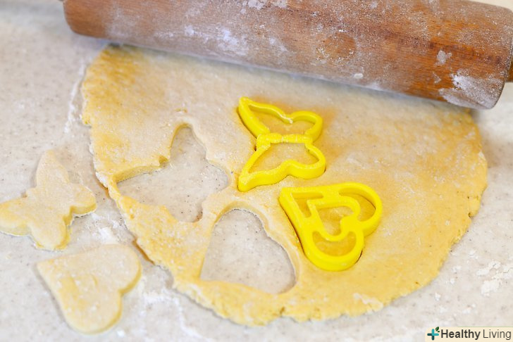 Розкачайте і поріжте тісто.дістаньте тісто з холодильника і покладіть його на посипану борошном поверхню. Розкачайте тісто качалкою до 3-міліметрової товщини. Поріжте тісто підходящої формочкою для печива.[31]- Щоб приготувати хрустке печиво, слід розкачати тісто до відповідної товщини.