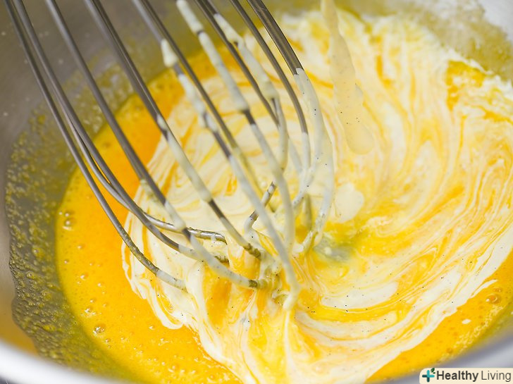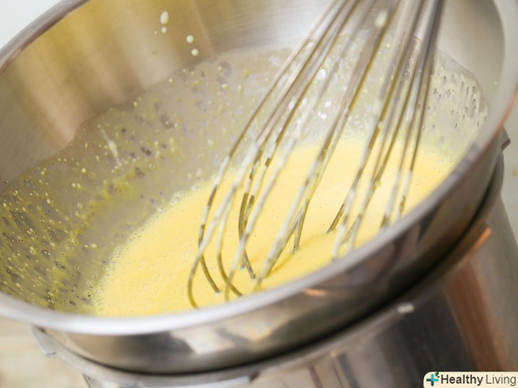 Знову нагрійте на плиті вершкову суміш.коли вона нагріється, повільно змішайте її з яєчною сумішшю. Помістіть крем і яєчну суміш в мисці над киплячою водою.