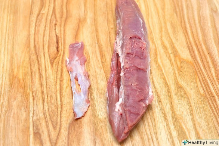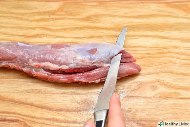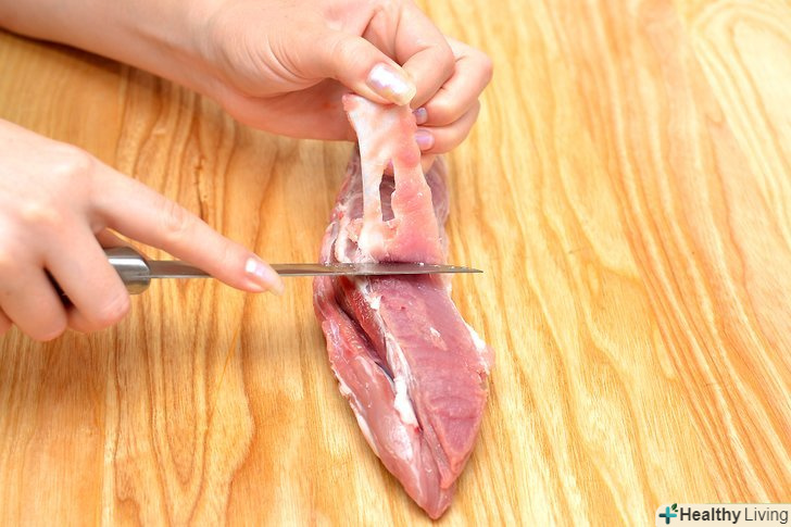 Використовуючи кінчик ножа, зробіть невеликий розріз в м'ясі на початку шкури.надріз повинен проходити убік і під шкуру, підніміть її трохи.