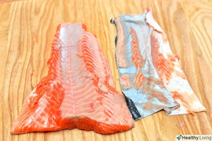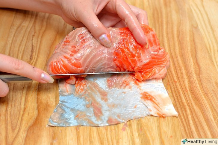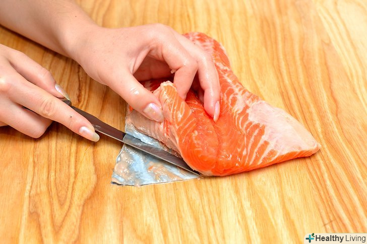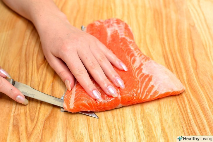 Притисніть міцно до обробної дошки вільною рукою рибу, використовуйте ніж, щоб акуратно відокремлювати з краю шкірку від риби.