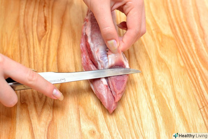 Потягніть шкуру вгору, вставляючи обвалочний ніж під шкуру.
