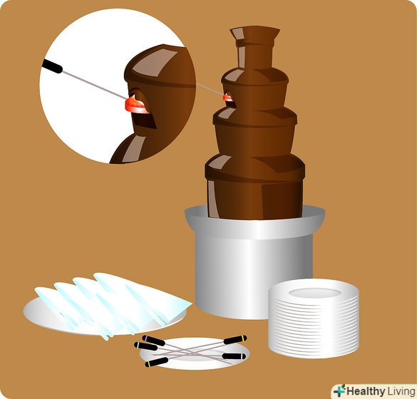 Покладіть шпажки, тарілки і серветки поблизу для ваших гостей, щоб вони могли обслуговувати самі себе.у вас повинно бути достатньо шпажок і столових приладів для кожного з гостей, щоб їм не довелося ділитися. Гості можуть покласти вибрані продукти на тарілки, а потім нанизувати на шпажку кожен шматочок і утримувати його під потоком шоколаду, перш ніж з'їсти. Зверніть увагу, що навколо фонтану буде безлад, тому що шоколад буде капати, коли гості будуть обслуговувати себе.