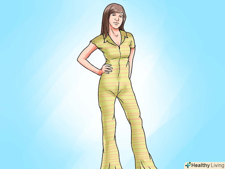 Зверніть увагу на комбінезони, які носили в 70-х. зазвичай це був цілісний комбінезон, зроблений з спандекса. Як правило, комбінезон був обтягуючим від стегна до коліна і розкльошені від коліна. У нього могли бути розкльошені рукава, починаючи з ліктя, а також комбінезон міг і зовсім не мати рукавів. Багато комбінезони мали короткий верх або V-подібний виріз.