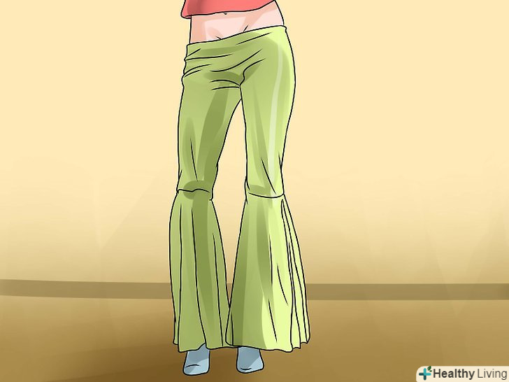 Знайдіть штани кльош.підійдуть штани, розкльошені від коліна. Замість джинсової тканини вибирайте атлас або поліестер.
