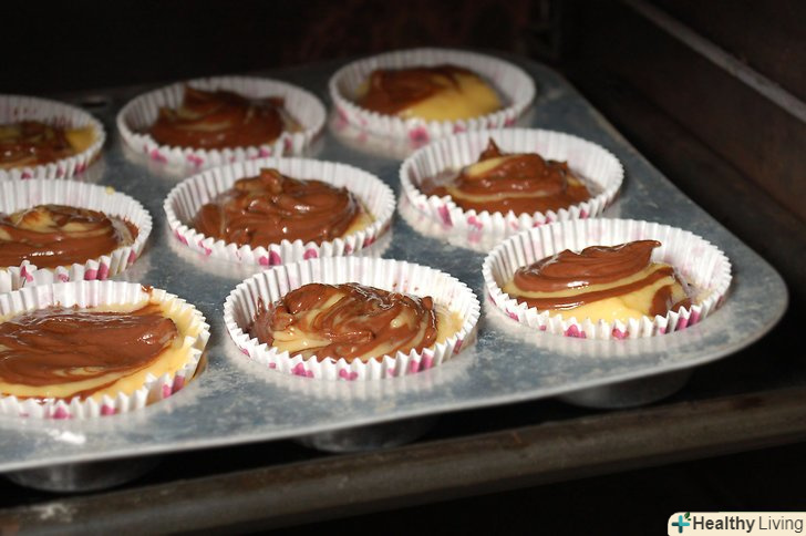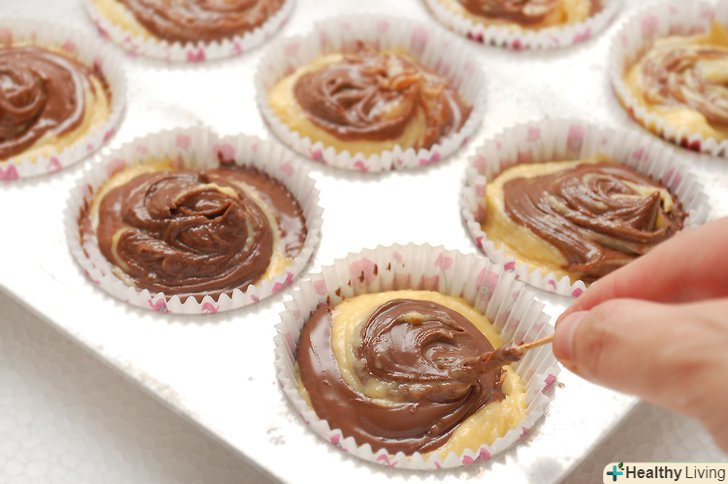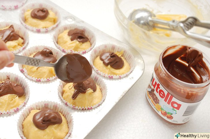 За допомогою ложки для морозива, заповніть кожну формочку.якщо ви не користуєтеся ложкою для морозива, а накладаєте звичайною столовою ложкою, то стежте, щоб кожна формочка була заповнена не більше ніж на три чверті, оскільки кекси значно піднімуться. Покладіть на кожен кекс по півтори чайної ложки шоколадної пасти Nutella.