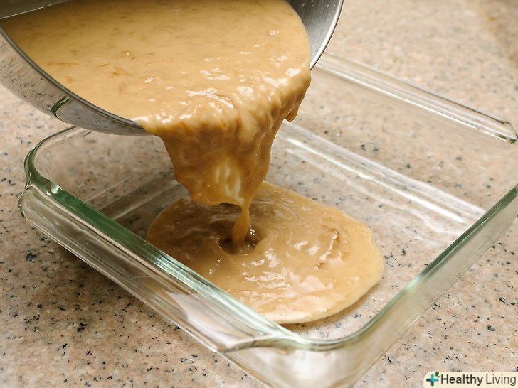 Акуратно перелийте кавову суміш в квадратну скляну миску розміром 20 х 20 сантиметрів.- Щоб отримати тонкі кубики кавового желе використовуйте скляне блюдо розміром 18 х 28 сантиметрів або 23 х 33 сантиметри.
