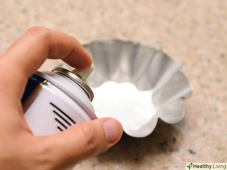 Змастіть формочки для випічки.Візьміть 6-8 формочок для випічки бріошів і збризніть антипригарним кулінарним спреєм. Чистим паперовим рушником розподіліть його тонким шаром по дну і сторонам посуду.[6]- В ідеалі слід використовувати форми діаметром 10 сантиметрів або об'ємом 125 мілілітрів (1/2 склянки). Форми для випічки бріошів підійдуть найкраще, адже в них желе буде виглядати привабливо, але можна взяти і інший посуд схожого розміру.