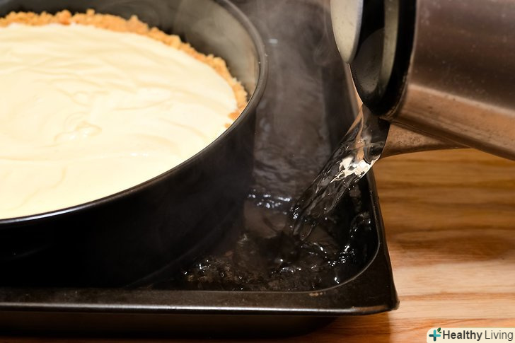 Поставте форму на деко з високими стінками.Закип'ятіть 2 літри води. Як тільки вода закипить, акуратно вилийте її в деко, таким чином, щоб вона досягла середини форми. У той час як це може здатися дивною інструкцією, насправді, ви готуєте чізкейк на водяній бані, яка допоможе приготуватися начинці без розтріскування коржа.