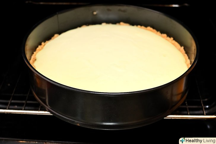 Поставте форму в деко на нижню решітку духовки.Встановіть таймер на півтори години, і нехай чізкейк випікається. Після того, як пройде час випікання, відкрийте духовку і злегка посувайте чізкейк назад і вперед, щоб переконатися, що він готовий. Серединка чізкейку повинна злегка тремтіти, а краї повинні бути твердими. Коли чізкейк охолоне, серединка стане пружною.