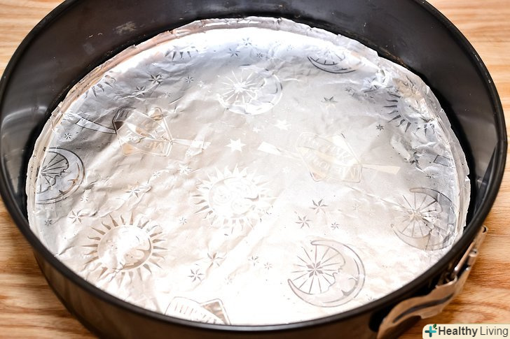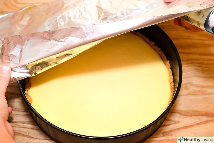 Покрийте форму для торта алюмінієвою фольгою.щоб приготувати найкращий чізкейк, який ви коли-небудь їли, необхідно випікати його, поставивши форму в киплячу воду (про це буде сказано в третій частині). Щоб вода не просочилася в форму і не зіпсувала корж, потрібно щільно обернути її алюмінієвою фольгою. Покладіть шматок фольги під форму, потім оберніть фольгу навколо форми і складіть її таким чином, щоб вона не перегиналася через краї.- При необхідності, використовуйте другий шматок фольги, щоб покрити місця, які не покрила перша половина фольги.